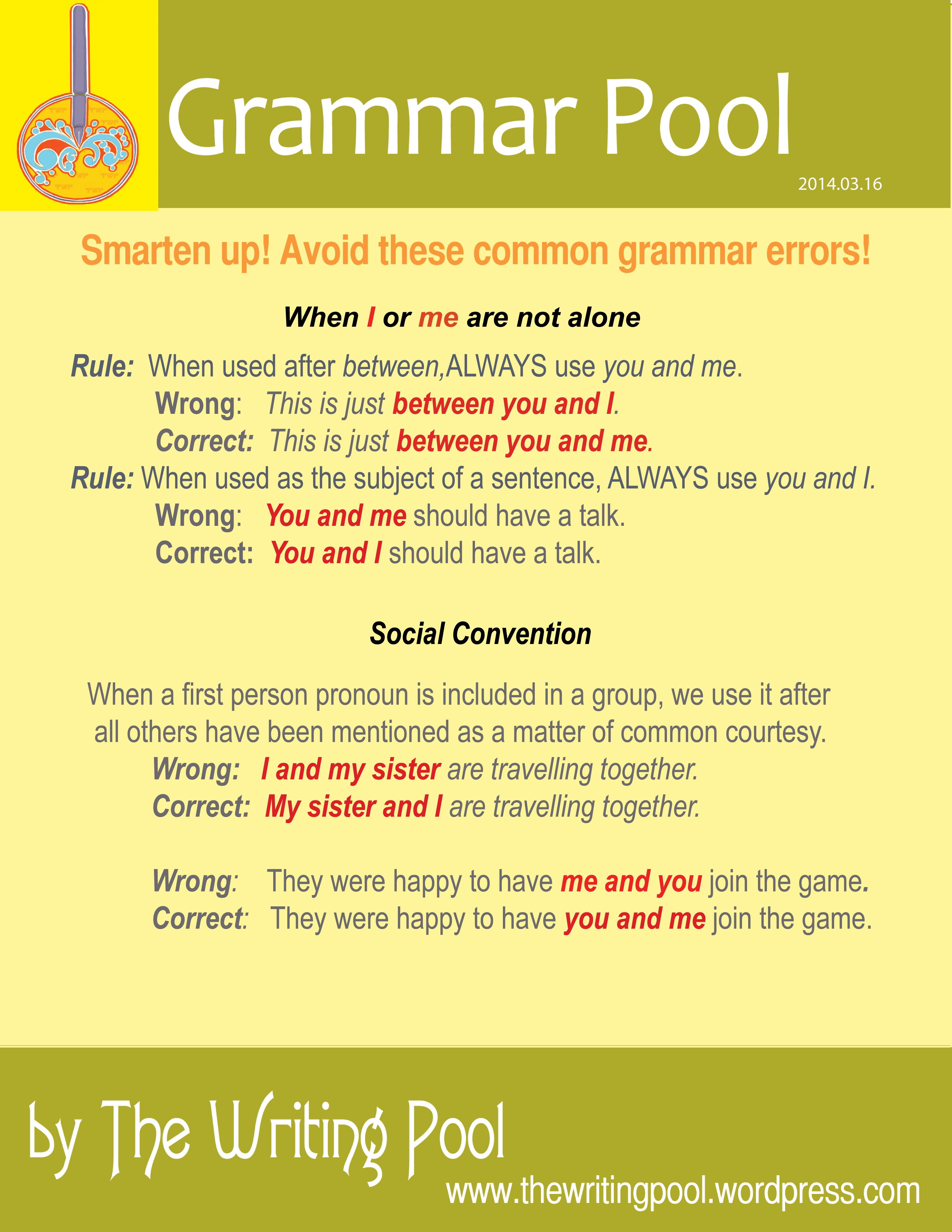 Grammar Pool Grammar Pool: When I and me are not alone Posted by Cindy on March 16, 2014 Share this: Click to share on X (Opens in new window) X Click to share on Facebook (Opens in new window) Facebook Like Loading... Related